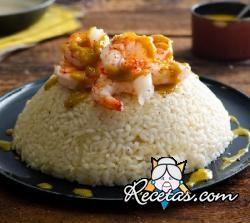 Voltear el molde sobre el plato de servir, en modo de obtener una "rosquilla" de arroz. Colocar las gambas en el centro y cubrir con la salsa picante y pimienta molida. Servir de inmediato.