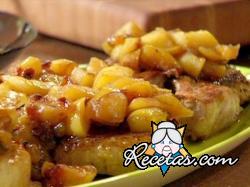 Cubrir las costillitas con las tajadas de manzana; espolvorear con azúcar y rociar con el vino. Llevar la fuente al horno a temperatura moderada, hasta que las costillitas estén cocidas y el vino se haya prácticamente evaporado.
