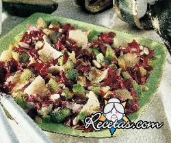 Disponer la achicoria en un plato para servir, espolvorear las almendras y el parmesano, luego cubrir con el kiwi y el aguacate. Condimentar la ensalada de radicchio y kiwi justo antes de servir.