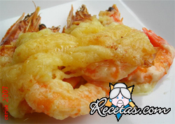 Preparación:Pela los langostinos sin arrancar la cola de la cabeza y colócalos con sal en una fuente de servir resistente al calor.Pica muy fina la cebolleta y ponla a pochar en aceite. Cuando este [+]