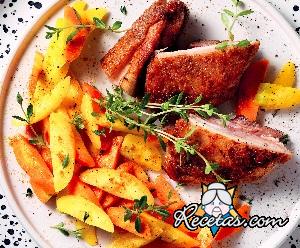 Limpiar la piel de los muslos, hacer dos incisiones paralelas al hueso y salarlos. Calentar un poco de aceite en una sartén y cocinar los muslos del lado de la piel durante 7-8 minutos, con un peso [+]