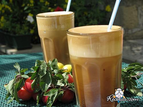 Vierta en un shaker o licuadora 2-3 cucharadas de agua, el café instantáneo y azúcar al gusto. Agite la mezcla hasta que se forme la espuma. Vierta la mezcla en un vaso alto, añada el resto del agua, [+]