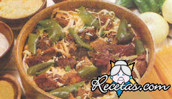 Limpiar y recortar la carne, preparándola en pedazos de 1,5 cm. Pelar y cortar la cebolla. Despepitar y cortar en tiras el pimiento.Calentar la manteca en una sartén o cacerola hasta que despida humo. [+]