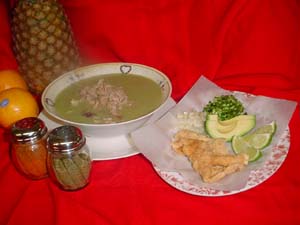 Rebanar los elotes y cocerlos con la carne de puerco en trozos y el pollo. Luego, tapar y dejar hervir . Cuando están cocidas las carnes, añadir los chiles, las lechugas, tomates, ajos y cilantro (todo [+]