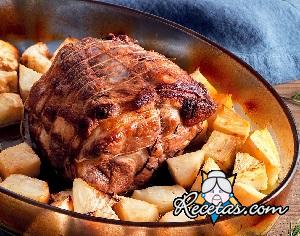 Pelar el apio nabo y cortarlo en cubos. Atar la carne de cerdo para que conserve su forma redonda, la forma más sencilla es hacer giros individuales de cuerda, separados 1-2 cm. Calentar 3 cucharadas de [+]