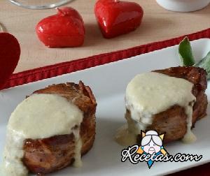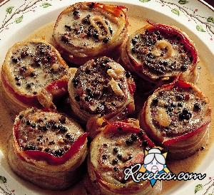 Cortar en 4 partes iguales el lomo de cerdo para obtener 4 medallones (eliminar la punta del extremo más fino). Envolver los bordes de cada medallón con las rebanadas de tocino, haciendo que queden bien [+]