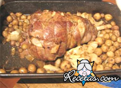 Precalentar el horno.Untar con aceite y el saborizador desmenuzado la pierna de cordero. Introducir en el horno, a 200ºC durante 15 minutos.Pelar las patatas y cortarlas en ruedas. Cortar las cebollas en [+]