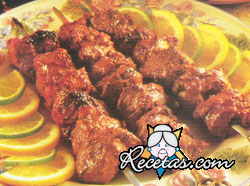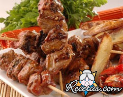 Coloque en un recipiente los dados de carne.Prepare la marinada con el kétchup, sal, azúcar negra, vinagre de manzana, salsa inglesa, aceite y agua y vuelque sobre la carne, macere varias horas.Escurra y [+]