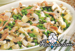Hervir los guisantes en agua con sal; escurrirlos y mezclarlos con los champiñones cortados en láminas, la manzana y el jamón en tiritas.Rociar con el zumo de limón y sazonar la ensalada con sal y [+]