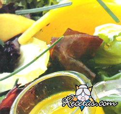 Para el aceite, licuar el mango junto con el aceite de oliva, la mostaza y la sal. Colar y reservar en un frasco. Lavar y escurrir las hojas verdes y la rúcula. Pelar y cortar el mango en rodajas y amar [+]
