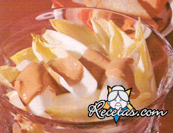 Separar las hojas de las endibias, lavarlas y secarlas. Poner en un cazo (tazón) la sal, el pimentón, el azúcar, la mostaza, el vinagre, la clara de huevo y mezclar bien. Verter gota a gota el aceite, [+]