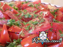 Pase los tomates por agua hirviendo durante un minuto, retÃrelos y pélelos. Córtelos en rodajas, sálelas y déjelas que suelten el agua. Mientras tanto pique la cebolla finita y la albahaca no muy [+]