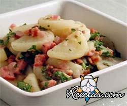 Cueza las papas con la cáscara, déjelas enfriar, pélelas y córtelas en cubos o rodajas. Corte la manzana igual que las papas, en dados o rodajas, sin pelarla; rocÃela enseguida con jugo de limón. [+]