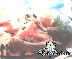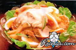 Lavar las hojas de lechuga, escurrirlas y tapizar el fondo de una ensaladera. Sobre la lechuga distribuir los camarones y la carne (si las rebanadas son muy grandes, cortarlas por el medio). Cortar las [+]