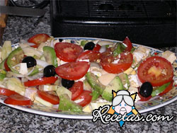 Lavar los tomates y cortarlos en rodajas o cubos.Pelar el pepino y cortarlo en rodajas.Pelar el aguacate, trozarlo y rociarlo con jugo de limón.Picar la cebolleta y descarozar las aceitunas.Desmigar el [+]