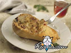 Cortar la calabaza al medio, a lo largo. Poner a cocinarla en agua hirviendo con sal unos 10 minutos (que quede cocida a medias).Quitar la pulpa de la calabaza, no toda, dejar más o menos un centÃmetro [+]