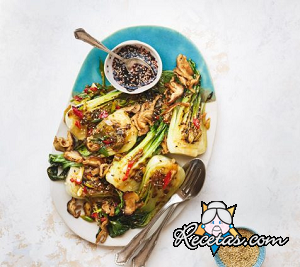 Limpiar cuidadosamente la col china con agua fría para eliminar todo rastro de tierra. Escurrir y secar ligeramente con una hoja de papel absorbente. Retirar la base con un cuchillo afilado y cortar el [+]