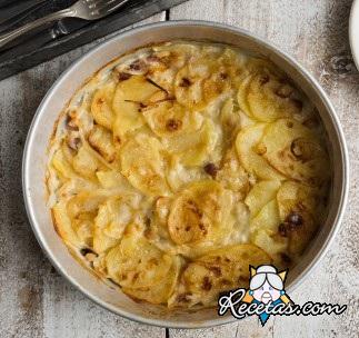Pelar las cebollas y las papas y cortarlas en rodajas finas, con un cuchillo o con la ayuda de una mandolina. Colocarlas en capas alternas en una sartén u olla antiadherente. Cortar la panceta en cubos y [+]