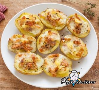 Lavar muy bien las patatas, dejando la cáscara intacta. Colocarlas en una cacerola con agua con sal y cocinar durante 20-25 minutos desde el hervor. Escurrir y dejarlas entibar. Con un cuchillo cortarlas [+]