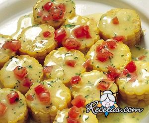 Cortar las mazorcas en trozos de 1,5 cm de espesor y hervirlos en una olla parcialmente cubierta en 1,5 litros de agua con sal, durante 20 minutos. Después de este tiempo, escurrir el maíz y colocarlos [+]