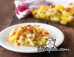 Pelar y lavar bien las patatas, secarlas, cortarlas en rodajas gruesas y colocarlas en una fuente de horno bien aceitada. Preparar la cubierta mezclando en un bol el la miga de pan desmenuzada, el queso [+]