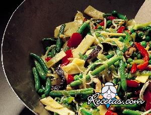 Cortar las judías verdes ya cocidas en trozos y cortar en trozosen cubitos los pimientos, brotes de bambú y setas chinas. Calentar en un wok 4 cucharadas de aceite a fuego alto. Agregar el puerro cortado [+]