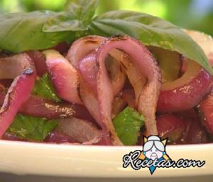 Pelar las cebollas, cortarlas en anillos de medio centÃmetro de espesor, separar las capas de los anillos y remojarlos en agua frÃa durante unos diez minutos. Calentar una placa de hierro fundido sobre [+]