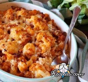 Limpiar la coliflor: quitar las hojas exteriores, el tallo y cortar las partes superiores; llevar a ebullición en abundante agua con sal, cocinando por unos 30 minutos; después de este tiempo, escurrir, [+]