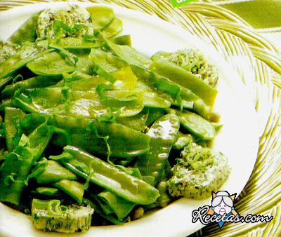 Pelar las judías planas, cortarlas al medio y cocinarlas al vapor, un poco “al dente”.En una cacerola derretir la mantequilla a baño maría, salar y agregar el ajo, una cda. colmada de cebollino, una [+]