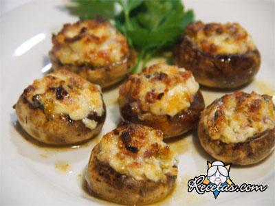 Lavar los champiñones y retirarles los tallos, para que quede la cabeza ahuecada. Picar los tallos junto con la cebolla y el ajo. Rehogar todo en una sartén con poco aceite, a fuego suave (sin moverlos [+]