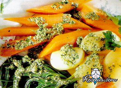 Hervir las verduras por separado, y escurrirlas. En un bol, desmenuzar el pan con una cucharada de vinagre y luego procesarlo junto con las anchoas, el ajo, las alcaparras y piñones, las yemas de huevo [+]