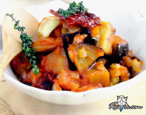 Cortar el tallo de las berenjenas, limpiarlas con agua y trocearlas en dados grandes. Dejarlas "sudando" en un colador, espolvoreadas con un poco de sal. En una cazuela amplia, calentar el aceite y añadir [+]