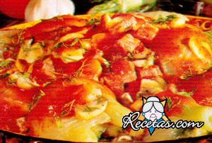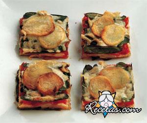 Pelar las patatas, cortarlas en rodajas y cocinarlas en una sartén grande a fuego alto, en una capa fina de aceite caliente, retirar y salar. Cortar el tomate en rodajas y el queso en láminas. [+]