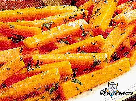Pelar y cortar la calabaza en bastones de 5 cm de largo. Salpimentar y llevar al fuego con la mantequilla. Cuando la mantequilla se derrita, cocinar la calabaza, sin dejar de mezclar, unos 8 minutos. [+]