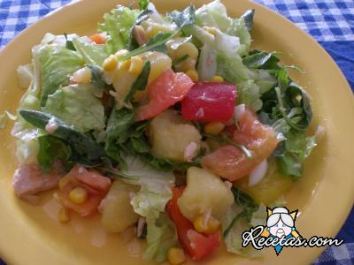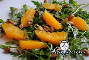 Lavar bien la rúcula y escurrir perfectamente. Forrar una ensaladera con las hojas enteras, y las restantes se cortan en trozos con las manos.Pelar las naranjas retirando también la parte blanca. Cortar [+]