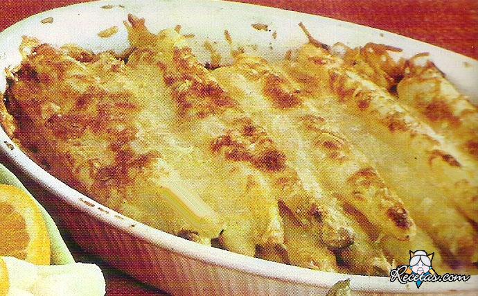Limpiar los espárragos, cortar, cocinar y escurrir.  Colocar en una fuente de horno enmantequillada, disponiéndolos todos en el mismo sentido. Sazonar con pimienta y poca sal.Espolvorear el queso [+]