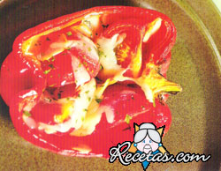 Lave y corte los morrones por la mitad, retire las semillas pero déjeles el tronquito (no se come pero queda lindo y hace que los morrones mantengan mas su forma). Coloque los morrones sobre una placa de [+]