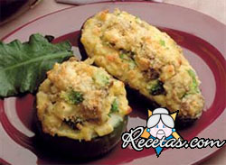 Quitar la tapa a los tomates, vaciarlos, salarlos y colocarlos boca abajo para que se escurran.Poner los tomates en una fuente para horno con una cdta. de aceite en cada uno. Hornear 10 minutos.Preparar [+]
