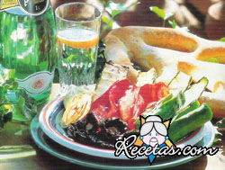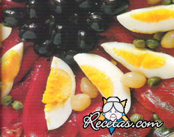 Asar los pimientos, pelarlos y quitarles las semillas. Hervir los huevos, pelarlos y cortarlos en 6 gajos cada uno.Colocar los pimientos en una fuente redonda, poner los huevos y las aceitunas, esparcir [+]