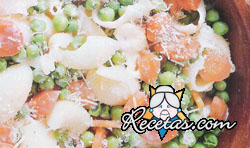 Hervir por separado los guisantes y las zanahorias. Escurrir. Cocer la pasta con abundante agua y sal, dejándola «al dente». Mezclar las hortalizas con la pasta y colocar en una cacerola.Fundir la [+]