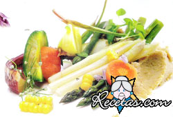 Para las verduras, blanquee por separado las zanahorias, los espárragos blancos, los zapallitos y las chauchas en abundante agua. Utilice 30 gr. de sal por litro. Filtre. Enfrié con agua helada. Filtre. [+]