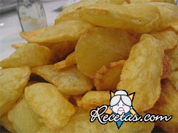 Pelar las papas, lavarlas, secarlas bien y tornearlas de manera tal que se asemejen a un cilindro. Cortarlas en rodajas de unos 3mm.Tener preparadas dos sartenes con abundante aceite, una a temperatura [+]