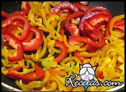 En una sartén con aceite de oliva, frÃa los chiles cortados. Cuando se ablanden, agregue la sal con los tomates cortados. Deje que se cocine y revuelva hasta que el aceite de oliva se seque. [+]