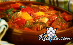 Lavar los pimientos y, abiertos en dos, quitar las semillas y cortarlos a tiras. Pelar los tomates, vaciarlos, trozarlos y cocerlos durante 30 minutos junto a las cebollas, los pimientos, las hojas de [+]