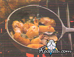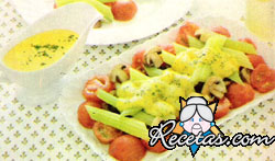 Lavar los champiñones, quitarles los tallos y cortarlos en mitades o en rodajas según su tamaño. Escaldar los tomates, pasándolos por agua hirviente, pelarlos y cortarlos en mitades. Pulir y lavar el [+]