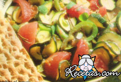 Picar la cebolla, cortar el ajà en tiritas y el zapallito en rodajas. Escaldar los tomates, pelarlos, cortarlos en trozos y quitar las semillas. Calentar el aceite en una sartén o guisera de teflón y [+]