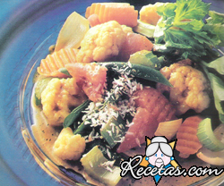 Separe en ramitos la coliflor, corte en aros la cebolla y en rodajas las zanahoÂrias y los zapallitos largos. Pele los toÂmates sumergiéndolos 1 minuto en agua hirviendo, saque las semillas y córtelos [+]
