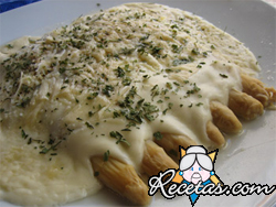 Preparación:Cocinar en agua con sal 2 atados de espárragos previamente lavados.Cuando estén cocidos, escurrirlos y acomodarlos en una fuente, de manera que las puntas queden hacia el centro de ésta. [+]