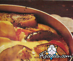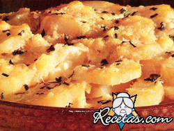 Preparación:Pele las papas, córtelas en rodajas bien finitas. Frote con el ajo una fuente de cerámica o de loza. Disponga las rodajas de papas en capas superpuestas. Hierva la leche y agregue sal, [+]