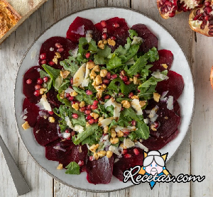 Para preparar el carpaccio de remolacha, pelar las remolachas, cortarlas muy finas con la mandolina y hacer una cama en un plato para servir. Salpimentar, esparcir la rúcula, los copos de parmesano, las [+]